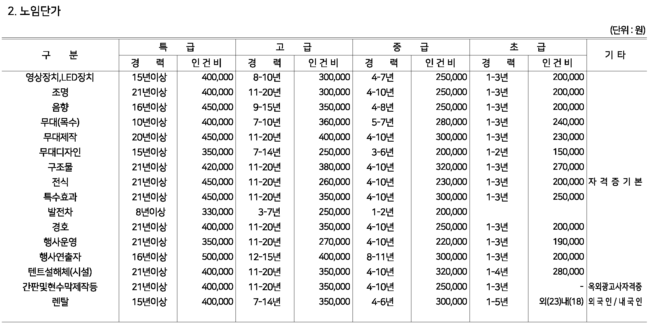 지난 6개월간의 연구활동을 통해 학술, 건출, 디자인, 엔지니어링, 건설, 출판 등의 인건비 실태를 조사하였고 기술 관련 전문가들과의 심층면접, 설문, 조사를 통해 객관적 지표를 설정하였다. 방송·행사 기술분야의 표준인건비 산정에 참고하면 된다.