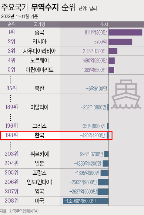 해당 기간 우리나라의 무역수지는 425억 달러 적자를 기록했는데, 12월에 적자가 심화하면서 누적 472억 달러까지 불어났다. 이를 고려하면 지난해 말 기준 순위는 이보다 더 떨어질 수 있다. 이미 지난해 3분기 말 194위에서 한 차례 밀려난 순위다.